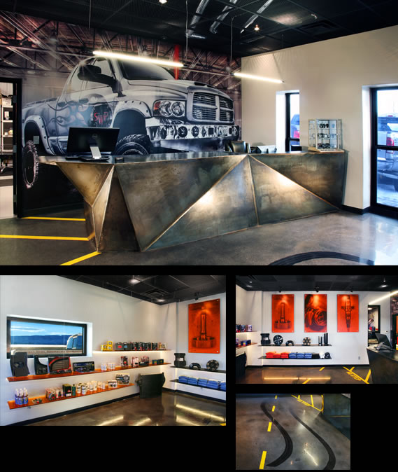 Second Wind Performance An interior show room remodel for a diesel performance shop featuring custom plate steel "stealth" sales counter, 3form translucent display shelving, polished concrete floor, and custom wall and floor graphics to emulate a street-scape.